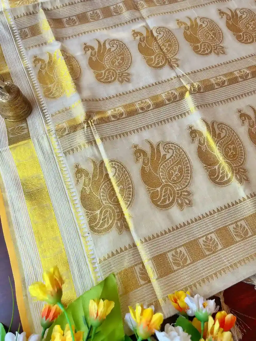 The Kerala Saree is a traditional Indian garment worn by women in the state of Kerala. It is made of cotton or silk and features a distinct border and intricate designs. The saree is draped around the body in a specific style and is typically paired with a blouse and scarf. It is known for its comfort and breathability, making it suitable for the hot and humid climate of Kerala. The saree is also popular for its cultural significance and is often worn on special occasions.