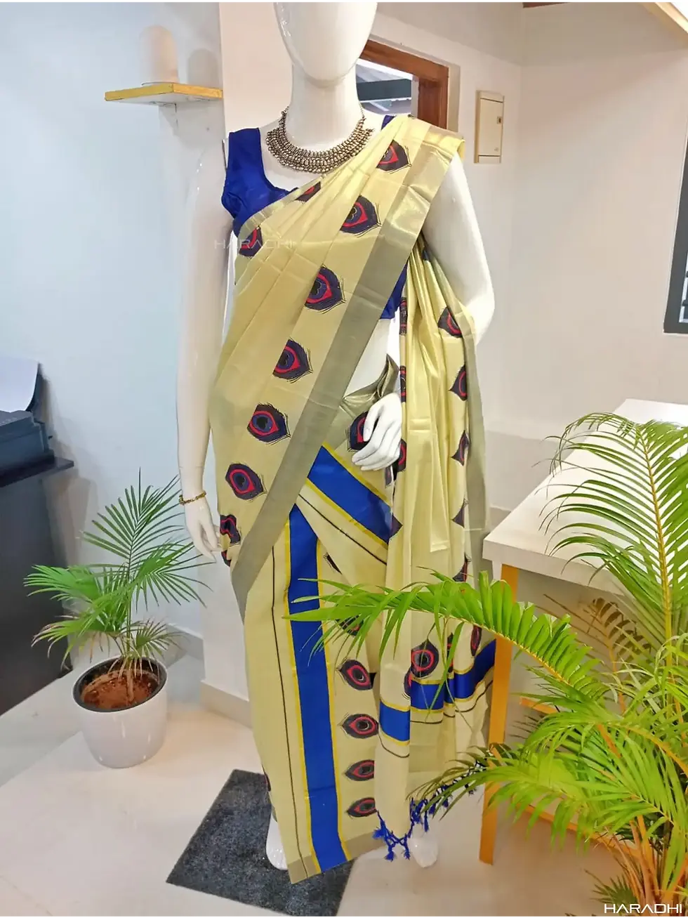 The Kerala Saree is a traditional Indian garment worn by women in the state of Kerala. It is made of cotton or silk and features a distinct border and intricate designs. The saree is draped around the body in a specific style and is typically paired with a blouse and scarf. It is known for its comfort and breathability, making it suitable for the hot and humid climate of Kerala. The saree is also popular for its cultural significance and is often worn on special occasions.