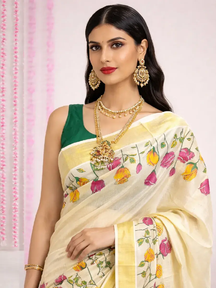 The Polka Dot Zari and Gold Kasavu Tissue Handloom Saree features elegant polka dot zari weaving on rich gold kasavu tissue fabric. The handloom finish adds a classic and graceful traditional look.